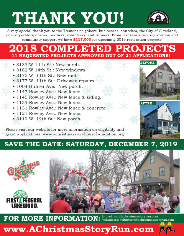 Proceeds from the A Christmas Story Run benefit the A Christmas Story House Foundation, a non-profit foundation established in 2013 to restore and maintain the neighborhood surrounding the A Christmas Story House & Museum for future generations to experience and enjoy. The foundation provides grants, both public and private, to projects that enhance and preserve the surrounding neighborhood. From last year’s race registration and community support we have $117,000 for upcoming 2019 restoration projects! The foundation also provides educational scholarships to A Christmas Story House employees as we invest in the future. To date, the race, sponsors, participants and community have raised over $500,000 dollars.